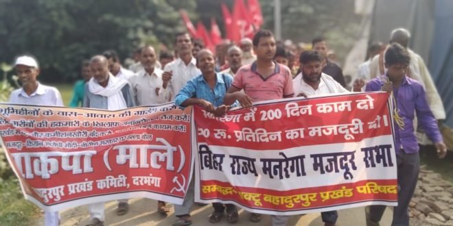 सैकड़ों लोगों ने कार्यक्रम में हिस्सा लेकर अधिकार में कटौती वर्दाश्त नही करेंगे और प्रतिरोध आंदोलन तेज करने का संकल्प लिया है। कार्यक्रम का नेतृत्व वहादुरपुर प्रखंड भाकपा माले सचिव अभिषेक कुमार , नंदलाल ठाकुर, जंगी यादव, गणेश महतो, हरि पासवान किए। अध्यक्षता दामोदर पासवान, नन्दू राम, विनोद सिंह ने किया । मांगपत्र bdo-co को ज्ञापन देकर कारवाई करने का आग्रह किया है। धरना को संबोधित करते हुए भाकपा माले जिला सचिव बैद्यनाथ यादव ने कहा कि यह कैसा सुशासन है कि गरीबो को कानून रहते हुए वास भूमि नही दिया गया है पेंशन स्वीकृत होने में वर्षो लग जाते है बाढ़ राहत की राशि नही मिली है। श्री यादव ने उपस्थित लोगों से आह्वान किया कि भाजपा जनता को काफी परेशानी में डाल कर भावना भड़का कर असली मुद्दों से भटकाने में लगा है हमे संकल्प लेना होगा कि एकजुट होकर आंदोलन को तेज करेंगे । कार्यक्रम में भोला पासवान ,कैलाश पासवान ,नेयाज अहमद, शिवन यादव भी मौजूद थे। कार्यक्रम हनुमाननगर में पप्पू पासवान , केवटी में धर्मेश यादव ,लक्ष्मण पासवान , सिंघवारा में सुरेन्द्र पासवान , सदर में शनिचरी देवी, पप्पू पासवान , सूर्यनारायण शर्मा , अलीनगर में अवधेश सिंह, किरतपुर में राजेंद्र यादव , गोरवोराम बिरौल में भी धरना दिया गया है और दिवाली से पहले राशन किरासन वितरण सुनिश्चित करने का मांग किया साथ ही बाध्य होकर डीलर पकड़ो राशन वसूलों अभियान चलाया जाएगा। इसके लिए भी प्रशासन ही जिम्मेवार होंगे।