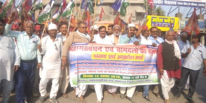 बिहार में व्याप्त अराजकता, भ्रष्टाचार, मंहगाई, चोरी-डकैती, लूट के खिलाफ महागठबंधन एवं वामदलों की ओर से आयोजित धरना और आक्रोश मार्च में दरभंगा समाहरणालय के समक्ष बिहार को बचाने के लिए संयुक्त संघर्ष को तेज करने का आवाह्न किया। धरना स्थल पर सभा की अध्यक्षता सीपीआई के राजीव चौधरी, कांग्रेस (ई) के सीताराम चौधरी, लोसपा के राजीव कुशवाहा, सीपीएम के गोपाल ठाकुर, राजद के प्रकाश कुमार ज्योति, हम के आर के दत्ता , वीआईपी के विनोद बंम्पर की संयुक्त अध्यक्ष मंडली ने की। धरनार्थियों को संबोधित करते हुए वक्ताओं ने एक स्वर से बिहार सरकार को उखाड़ फेंकने का संकल्प व्यक्त किया। सभा को रामकुमार झा, नारायण जी झा, दिलीप भगत, शरद कुमार सिंह, महेंद्र पोद्दार, लाल मुखिया, सुधीर कांत मिश्र, संतोष कुमार श्रीवास्तव, अहमद अली तमन्ने, चन्देश्वर सिंह, विश्वनाथ मिश्रा, वरूण कुमार झा, यदुवीर कुशवाहा, सफदर इमाम, मो० कलाम, त्रिभूवन कुमार, अविनाश ठाकुर, कामेश्वर पूर्वे, देवकांत यादव, जय प्रकाश नारायण पासवान, मो० कयूम फातमी, आदि नेताओं ने सम्बोधित किया। मांगों को लेकर एक स्मार पत्र जिला समाहर्ता को सुपुर्द किया गया।