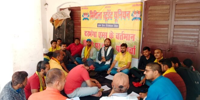मिथिला स्टूडेंट यूनियन के द्वारा दरभंगा एम्स में हो रही लेट लतीफी के खिलाफ चर्चा परिचर्चा जिला परिषद कार्यालय पर किया गया जिसमे विभिन्न लोगो ने सहभगिता देकर इसमें अपनी भागेदारी देने का काम किया बारी बारी से सभी बिंदुओ पर चर्चा करते हुए लोगो ने कहा की राज्य सरकार औऱ केंद्र सरकार की राजनीति ने दरभंगा एम्स को अधर में डाल रखा हैं जब तक भाजपा सरकार बिहार के राजनीति में थे तब तक शिलान्यास तक नहीं किया गया औऱ अब जब सरकार बदल गया तो यह मगध की सरकार मिथिला में एम्स ना बने इसके लिए साजिश रचने का काम कर रहे हैं पहले अशोक पेपर मिल ले जाने की बात कही हुए अभी शोभन में एम्स बनाने की बात चल रही हैं जब शोभन में ही एम्स बनाना था तो डीएमसीएच परिसर में शोभन का मिट्टी लाया ही क्यों गया क्या इससे पूर्व जिस भूमि को एम्स के लिए लौ लेंड कह कर रिजेक्ट किया गया तो इस हिसाब से शोभन का भूमि 20-30 फिट गहरा हैं क्या इसे रिजेक्ट नहीं किया जाएगा इससे स्पष्ट पता चलता हैं की दरभंगा से एम्स को छिना जा रहा हैं ताकि इसे भी मगध में ले जाकर स्थापित किया जाए आज 7 करोड़ लोगो के पास किसी भी तरह का स्वास्थ सुविधा नहीं हैं 4 करोड़ लोग डीएमसीएच पे आश्रित है जिसका हाल किसी से छुपा हुआ नहीं हैं आज गरीब से गरीब लोग डीएमसीएच जाना नहीं चाहते उन्हें प्राइवेट हॉस्पिटल के सहारे रहना पड़ता हैं अगर कम पैसा में सरकारी इलाज चाहते हैं तो उन्हें पटना या दूसरे राज्य पर निर्भर रहना पड़ता हैं इसके लिए दरभंगा एम्स यहां बहुत जरुरी हैं जिसे राज्य सरकार औऱ केंद्र सरकार राजनितिक मुद्दा बना कर यहां के लोगो के जीवन के साथ खिलवाड़ करने का काम कर रहे हैं जिसके खिलाफ अब आवाज उठाना बहुत जरुरी हो गया हैं ताकि 2024 लोकसभा चुनाव से पूर्व एम्स का शिलान्यास दरभंगा में हो सके जगह का चयनित हो सके औऱ इसके लिए हम सभी को जाती धर्म पार्टी से ऊपर उठकर दरभंगा एम्स के लिए जन-प्रतिनिधियों के खिलाफ मोर्चा खोलना पड़ेगा यहां के नेताओं को घर पर जाकर घेरना होगा बाहरी नेता को दरभंगा में घुशने नहीं देना होगा तभी अब दरभंगा एम्स के ऊपर किसी सरकार का नजर जा पायेगा