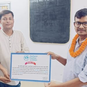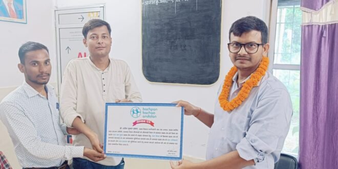 सीतामढ़ी: प्रखंड विकास पदाधिकारी बथनाहा सह सह अध्यक्ष प्रखंड स्तरीय बाल सरंक्षण समिति बथनाहा अजीत कुमार प्रसाद को नोबेल शांति पुरस्कार से सम्मानित कैलाश सत्यार्थी द्वारा स्थापित संगठन बचपन बचाओ आंदोलन के केंद्रीय निदेशक मनीष शर्मा के द्वारा सम्मान पत्र से सम्मानित किया गया हैं। बचपन बचाओ आंदोलन की ओर से केंद्र स्तरीय इस सम्मान पत्र को संगठन के सहायक प्रोजेक्ट ऑफिसर मुकुंद कुमार चौधरी ने मंगलवार को बीडीओ अजीत कुमार प्रसाद को सम्मान स्वरूप सम्मानपत्र भेट कर सम्मनित किया। गौरतलब है की बीडीओ अजीत कुमार प्रसाद को बथनाहा प्रखंड को जिला का पहला बाल श्रम मुक्त प्रखंड क्षेत्र बनाने में उत्कृष्ट योगदान, बाल विवाह के खिलाफ प्रखंड क्षेत्र में लगातर करवाई एवं जन जागरुकता सुनिश्चित करवाने साथ ही प्रखंड क्षेत्र में बाल संरक्षण समिति के माध्यम से बाल अधिकारों के संरक्षण और बाल कल्याण को सुनिश्चित करने हेतु बचपन बचाओ आंदोलन की ओर से केंद्र स्तरीय सम्मान पत्र देकर सम्मानित किया गया है।