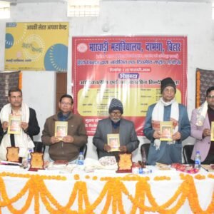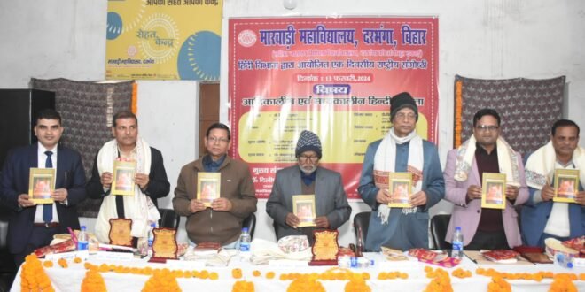 मारवाड़ी कॉलेज, दरभंगा के हिंदी विभाग द्वारा “आदिकालीन एवं मध्यकालीन हिंदी कविता” विषय पर एक दिवसीय राष्ट्रीय संगोष्ठी का आयोजन किया गया। संगोष्ठी की शुरुआत दीप प्रज्वलन एवं अथिति स्वागत गीत के साथ हुई। जिसमें गोष्ठी के संयोजक डॉ. अनिरुद्ध सिंह अध्यक्ष, हिंदी विभाग मारवाड़ी महाविद्यालय द्वारा स्वागत वक्तव्य के बाद पाग, चादर और स्मृति चिन्ह से सम्मानित किया गया। तादोपरांत आगंतुक सम्मानित अतिथियों एवं वक्ताओं के कर कमलों द्वारा ‘आदिकालीन एवं मध्यकालीन हिंदी कविता’ और ‘हिंदी: निबंध-संग्रह’ पुस्तकों का लोकार्पण किया गया। नई दिल्ली से आए अक्षर पब्लिशर्स एंड डिस्ट्रीब्यूटर्स के निदेशक श्री नरेंद्र जी ने कहा कि हम सभी के लिए यह सुखद संयोग है जो ज्ञान पर्व के अवसर में विद्वत जनों द्वारा पुस्तक विमोचन एवं गोष्ठी में उपस्थित हुआ। निश्चित ही यह दोनों पुस्तकें और यह गोष्ठी विद्यार्थियों के लिए बहुत उपयोगी साबित होगी। स्वागत वक्तव्य में डॉ.सिंह जी द्वारा बताया गया कि इस गोष्ठी में विभिन्न राज्यों से अनेक साहित्य प्रेमी, शोधार्थी एवं शिक्षकगण पंजीकरण कर शोध सारांश एवं शोध आलेख प्रस्तुत किया।