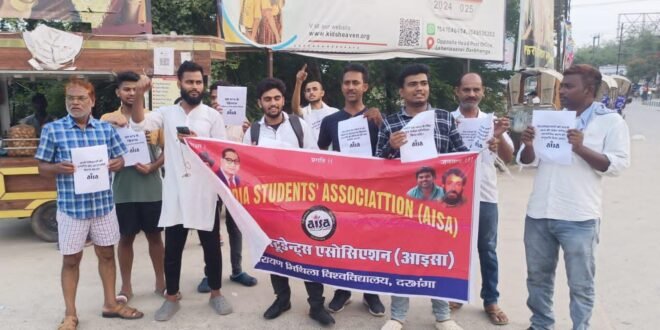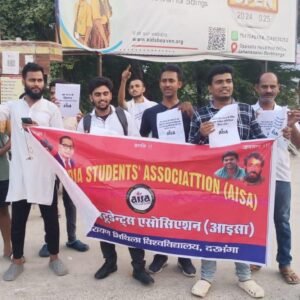 आइसा ने नीट यु.जी. के परीक्षा में हुए धांधली के खिलाफ दरभंगा इकाई द्वारा प्रतिरोध दिवस मनाया गया। जिला अध्यक्ष मो शम्स तबरेज ने सभा को सम्बोधित करते हुए कहा कि केन्द्र और राज्य में बैठी डबल इंजन की सरकार NEET UG परीक्षा में हुए धांधली पर चुप्पी साधे बैठी है, देश की सबसे बङी प्रतिस्पर्धा वाली परीक्षा में NTA के द्वारा अनियमितता लगातार बढ़ते जा रहा है और अभ्यर्थीयों का भविष्य को कुचला जा रहा है। देश में 45 वर्षो में बेरोजगारी दर 21.11% से ऊपर बढ़ता जा रहा है. रेलवे में केन्द्र सरकार के अधीन 30 लाख रिक्त पद है तमाम सरकारी सेक्टरो में बहाली करने के वजाय पदों को समाप्त कर रहे है निजीकरण और बाजारीकरण की ओर अमादा है ऐसे में केंद्र सरकार उच्च शिक्षा को अभिजात वर्गो को आरक्षित करनी चाहती है मेडिकल के क्षेत्र में मजदूर-किसान वर्ग के छात्र-छात्राओं को महरूम कर रही है NEET UG 2024 के परीक्षा को रद्द की जाए नेशनल टेस्टिंग एजेंसी पर उच्च स्तरीय जांच कर जल्द से जल्द शख्त कानूनी कार्रवाई की जाए और पुनः नीट यु.जी. परीक्षा को आयोजित किया जाए। NTA द्वारा CUET-UG, PG NEET की परीक्षा लेने पर अविलंब रोक लगाया जाए।
