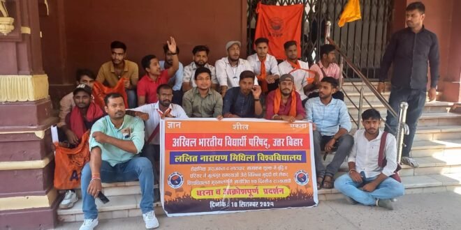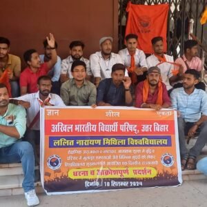 अखिल भारतीय विद्यार्थी परिषद, दरभंगा एवं मधुबनी विभाग के कार्यकर्ताओं द्वारा मिथिला विश्वविद्यालय में व्याप्त भ्रष्टाचार, शैक्षणिक अराजकता, नामांकन में मनमानी फीस वसूली, व परीक्षा परिणाम में निरंतर व्यापक त्रुटियों को लेकर विश्वविद्यालय मुख्यालय में आक्रोश मार्च एवं धरना प्रदर्शन किया गया। धरना उपरांत माननीय कुलपति की मुख्यालय में अनुपस्थिति में प्रतिनिधिमंडल द्वारा माननीय कुलसचिव को ललित नारायण मिथिला विश्वविद्यालय में छात्र हित से संबंधित 15 सूत्री ज्ञापन सौंपा गया।