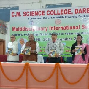 कार्यक्रम के दूसरे सत्र में सीएम साइंस कॉलेज के भौतिकी विभाग के शिक्षक डा अजय कुमार झा लिखित पुस्तक ‘एंड इंट्रोडक्शन टू सॉलिड स्टेट फिजिक्स’ का विमोचन महाविद्यालय के प्रधानाचार्य प्रो दिलीप कुमार चौधरी के द्वारा किया गया। अपने संबोधन में प्रधानाचार्य ने कहा कि इस तरहकी संगोष्ठियों के आयोजन से जहां छात्र-छात्राओं में समुचित ऊर्जा का संचार होता है वही, नई पुस्तकों के लेखन से उनके शैक्षणिक ज्ञान को एक नया आयाम प्राप्त होता है। उन्होंने डा अजय कुमार ठाकुर की लिखी पुस्तक की तारीफ करते कहा कि यह पुस्तक स्नातक एवं स्नातकोत्तर के छात्र छात्राओं के लिए काफी उपयोगी साबित होगा। उन्होंने अन्य शिक्षकों से भी पुस्तक लेखन के क्षेत्र में आगे आने का आह्वान किया।इस अवसर पर विशिष्ट अतिथि के तौर पर पीजी भौतिकी विभाग के प्रो अरुण कुमार सिंह, महाविद्यालय के भौतिकी विभागाध्यक्ष डॉ यूके दास आदि उपस्थित थे। संगोष्ठी के विभिन्न तकनीकी सत्रों की अध्यक्षता करते हुए प्रो एस एन सिंह एवं प्रो अरुण कुमार सिंह ने इस अंतरराष्ट्रीय संगोष्ठी के आयोजन को स्नातकोत्तर के छात्रों एवं आने वाली पीढ़ी के लिए अत्यंत उपयोगी बताया। उन्होंने कहा कि इस प्रकार के संगोष्ठी के आयोजन से शिक्षा एवं समाज को एक नई उन्नत दिशा मिलती है।