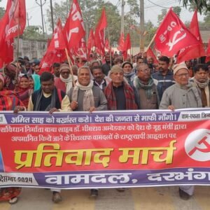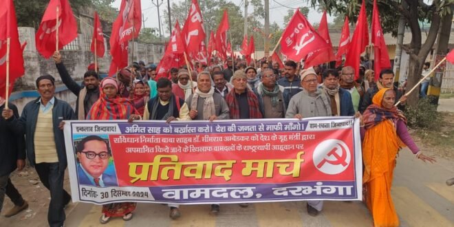वाम दलों के संयुक्त आह्वान पर देश व्यापी प्रतिवाद दिवस के तहत दरभंगा में सीपीआई, सीपीआईएम, एवं सीपीआई एम एल के जिला सचिव के नेतृत्व में लहेरिया सराय पोलो मैदान से हजारों लोगों का मार्च पिछले संसदीय सत्र के दौरान संविधान निर्माता बाबा साहब पर अपमान जनक टिपणी के खिलाफ गृहमंत्री अमित शाह के बरखास्तगी की माँग एवं देश के आवाम से गृहमंत्री माफ़ी मांगो एवं संविधान व लोकतंत्र पर हमला नहीं सहेंगे जैसे नारे लगाते हुए बाबा साहब के स्मारक स्थल पर पहुँचा जहाँ बाबा साहब पर माल्या अर्पण करने के वाद मार्च रेलवे स्टेशन, चट्टी चौक, पोस्ट ऑफिस होते हुए लहेरया सराय टॉवर, लोहिया चौक होते हुए पुनः टॉवर होते हुए जिला समहरणालय होते हुए लहेरिया सराय कमीशनरी होते हुए रोटरी क्लब पहुंचा जहाँ प्रदर्शनकारियों की एक सभा आयोजित किया गया सभा की अध्यक्षता भाकपा माले जिला कमिटी सदस्य सह ऐकटू जिला सचिव उमेश प्रसाद साह, सीपीआई के साथी अहमद अली तमन्ने, सीपीआई एम के साथी दिनेश झा ने संयुक्त रूप से किया।
