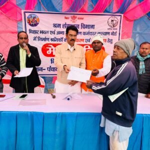 उन्होंने उपस्थित लोगो से आह्वान किया गया कि ज्यादा से ज्यादा पात्र श्रमिक अपना निबंधन करवायें। साथ ही बिहार भवन एवं अन्य सन्निर्माण कर्मकार कल्याण बोर्ड के अंतर्गत विभिन्न योजनाओं के अंतर्गत विवाह सहायत अनुदान योजना से लाभान्ति पुकार राम,राजेश सहनी,विनोद सहनी,डोमु यादव,राम सूचित यादव,रामु यादव,अजित मंडल एवं आशा देवी,पेंशन योजना के अंतर्गता सरस्वती देवी,मातृत्व योजना अंतर्गत लाभांन्वित आभा कुमारी,भवन मरम्मति अनुदान अंतर्गत लाभान्वित अजित मंडल,मृत्यु सहायता अनुदान अंतर्गत कैलाश दास एवं राम बहादुर भगत को स्वीकृत्यादेश की प्रति प्रदान की गयी।