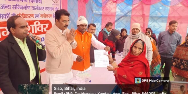 दरभंगा ‘‘सदर प्रखंड दरभंगा के करकौली में विशेष मजदूर शिविर का आयोजन किया गया। शिविर में विधायक नगर संजय सरावगी, प्रखंड प्रमुख, मुखिया शिशो पश्चिमी/शिशो पूर्वी एवं सहबाजपुर पंचायत,राकेश रंजन उप श्रमायुक्त, दरभंगा प्रमण्डल दरभंगा, दिनेश कुमार श्रम अधीक्षक योजना सह बोर्ड, किशोर कुमार झा, श्रम अधीक्षक अधिनियम दरभंगा, मोहन कुमार श्रम प्रवर्त्तन पदाधिकारी सदर, लक्ष्मण कुमार झा श्रम प्रवर्त्तन पदाधिकारी सिंहवाड़ा, विजेता भारती श्रम प्रवर्त्तन पदाधिकारी बहेड़ी एवं अन्य गणमान्य व्यक्ति तथा आस-पास के लगभग 1500 योग्य निर्माण श्रमिक/मनरेगा श्रमिक उपस्थित हुए।
