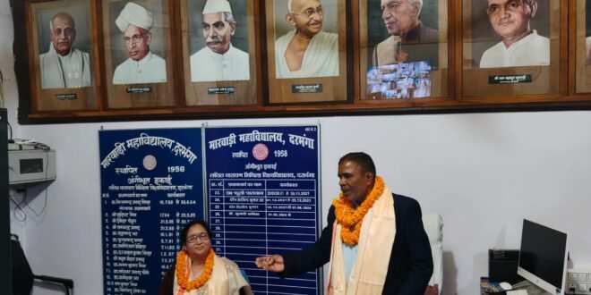 मारवाड़ी महाविद्यालय दरभंगा में अर्थशास्त्र विभागाध्यक्ष डॉ.बिनोद बैठा ने प्रभारी प्रधानाचार्य के रूप में पदभार ग्रहण किया। उन्होंने सभी शिक्षक एवं शिक्षकेतर कर्मचारियों सहित छात्र – छात्राओं को नियमित महाविद्यालय आने और कार्यों का संपादन करने का आह्वान किया। उन्होंने निवर्तमान प्रधानाचार्या डॉ.कुमारी कविता की सेवानिवृत्ति पर बधाई दी और उनके आगामी जीवन के लिए मंगलकामनाएं प्रस्तुत की। उन्होंने सभी से अनुरोध किया कि सभी के सहयोग से महाविद्यालय को आगे ले जाना है।