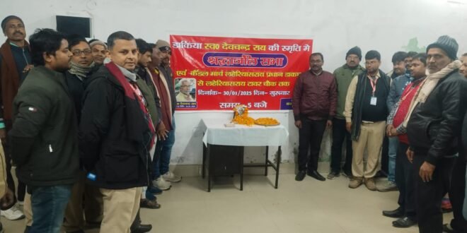 डाक विभाग के सम्मानित डाकिया स्व. देवचंद्र प्रसाद राय जी की स्मृति में राष्ट्रीय डाक कर्मचारी संघ (डाकिया एवं एमटीएस), दरभंगा प्रमंडल द्वारा आज लहेरियासराय प्रधान डाकघर परिसर में एक श्रद्धांजलि सभा का आयोजन किया गया।