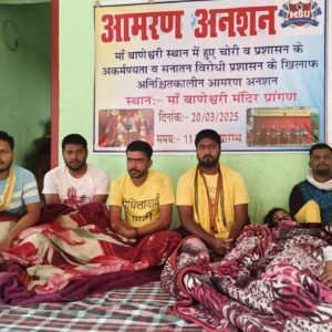 बाणेश्वरी भगवती स्थान, मनीगाछी – माँ बाणेश्वरी भगवती स्थान में हुई चोरी के विरोध में न्याय की मांग को लेकर आदित्य मंडल और रमेश बाबा का अनिश्चितकालीन अनशन आज दूसरे दिन में प्रवेश कर चुका है। बावजूद इसके, प्रशासन की ओर से अब तक कोई ठोस कदम नहीं उठाया गया है, जिससे भक्तों और आंदोलनकारियों में गहरी नाराजगी है। प्रखंड विकास पदाधिकारी दुनियालाल यादव ने धरना स्थल पर पहुंचे, अनशनकारी के साथ वार्ता अशफल रहा