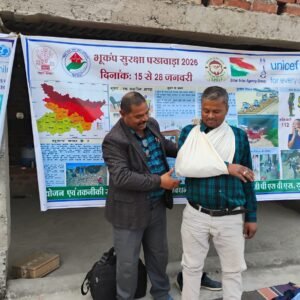 दरभंगा भूकंप सुरक्षा पखवाड़ा के अंतर्गत जिला आपदा प्रबंधन द्वारा एसडीआरएफ और बिहार इंटर एजेंसी ग्रुप यूनिसेफ जीपीएसवीएस के सहयोग से जिले में सभी स्तरों पर भूकंप से होने वाले खतरे और क्या करें,क्या न करें तथा भूकम्प के दौरान घायलों के प्राथमिक उपचार विषय पर प्रशिक्षण और मॉक ड्रिल कराया जा रहा है।