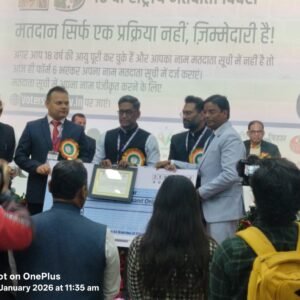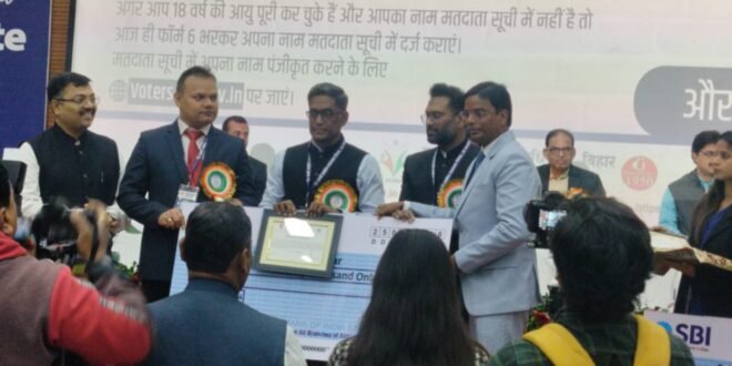 दरभंगा राज्यस्तरीय Best Electoral Practices Awards–2025 के अन्तर्गत 16वें राष्ट्रीय मतदाता दिवस के अवसर पर आज 25 जनवरी 2026 को अधिवेशन भवन, सिंचाई भवन परिसर, पटना में आयोजित राज्य स्तरीय समारोह में जिले के चयनित पदाधिकारी को सम्मानित किया गया।